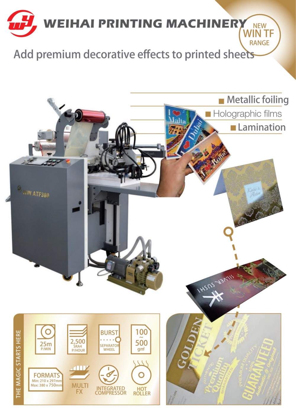Prasa do laminowania i foliowania arkuszowego o szerokości 380 mm umożliwia automatyczne tłoczenie na gorąco wzorów metalicznych i kolorowych bez tradycyjnych płyt do tłoczenia na gorąco. Nadaje się nie tylko do krótkotrwałych zastosowań cyfrowych na żądanie, ale także do tradycyjnych wydruków litograficznych offsetowych. Wykorzystuje folie holograficzne do automatycznego tworzenia wzorów punktów i fal, dzięki czemu drukowane materiały są jeszcze bardziej wyjątkowe.