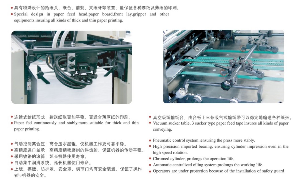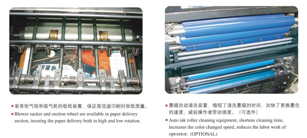 Jeśli chodzi o czterokolorową, niskonakładową maszynę offsetową A2, jest ona zbudowana z modułów o wysokiej wydajności, dzięki czemu jest niezawodna — idealna do zadań drukowania niskonakładowego. Moduły te obejmują precyzyjne rolki i przekładnie, solidny mechanizm podawania papieru, precyzyjny system rejestracji papieru oraz system stałego podawania atramentu. Spełnia potrzeby rynku w zakresie kolorowego druku w arkuszach, który charakteryzuje się wysoką jakością, wydajnością i opłacalnością, szczególnie w przypadku zleceń niskonakładowych. Obsługuje szeroki zakres grubości papieru — od cienkiego papieru o grubości 0,04 mm po karton o grubości 0,4 mm. A dzięki sterowaniu za pomocą ekranu dotykowego i intuicyjnemu interfejsowi programowania możesz z łatwością wprowadzać inteligentne zmiany wszystkich ustawień i parametrów drukowania.