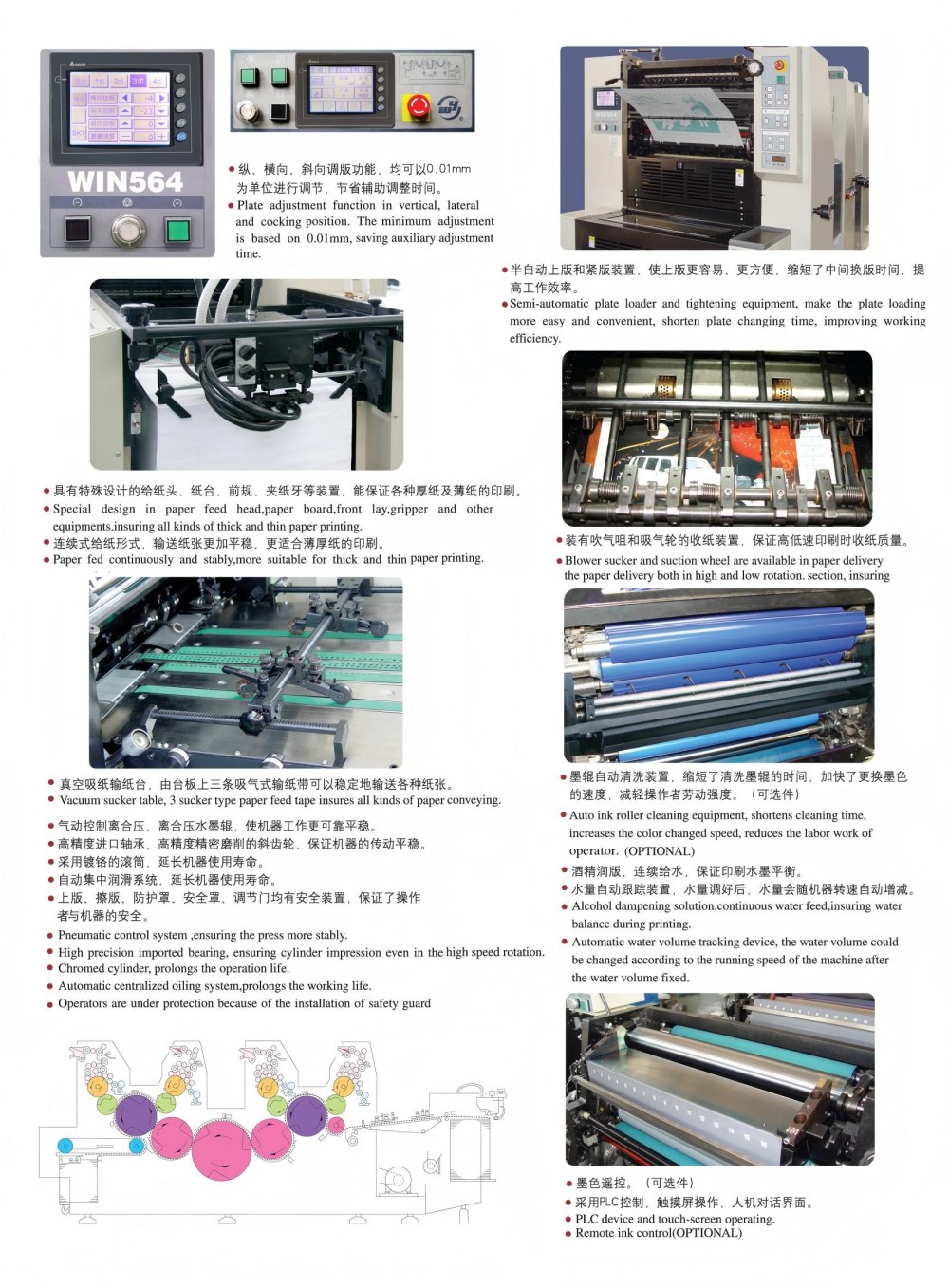 Czterokolorowa maszyna offsetowa do etykiet A2 została zaprojektowana z wykorzystaniem modułów o wysokiej wydajności i wszystkie są najwyższej jakości — precyzyjne rolki i przekładnie, mocny mechanizm podawania papieru, wysoce precyzyjny system rejestracji papieru i stabilny system podawania atramentu. Została dostosowana do wymagań rynku w zakresie kolorowego druku w arkuszach, który charakteryzuje się wysoką jakością, wydajnością i przystępną ceną. Nie musisz też trzymać się jednej grubości papieru – działa zarówno od cienkiego papieru (0,04 mm), jak i grubego kartonu (0,4 mm). Dostępny jest również ekran dotykowy z intuicyjnym interfejsem programowania, umożliwiający dostosowanie ustawień i parametrów drukowania w inteligentny i prosty sposób.