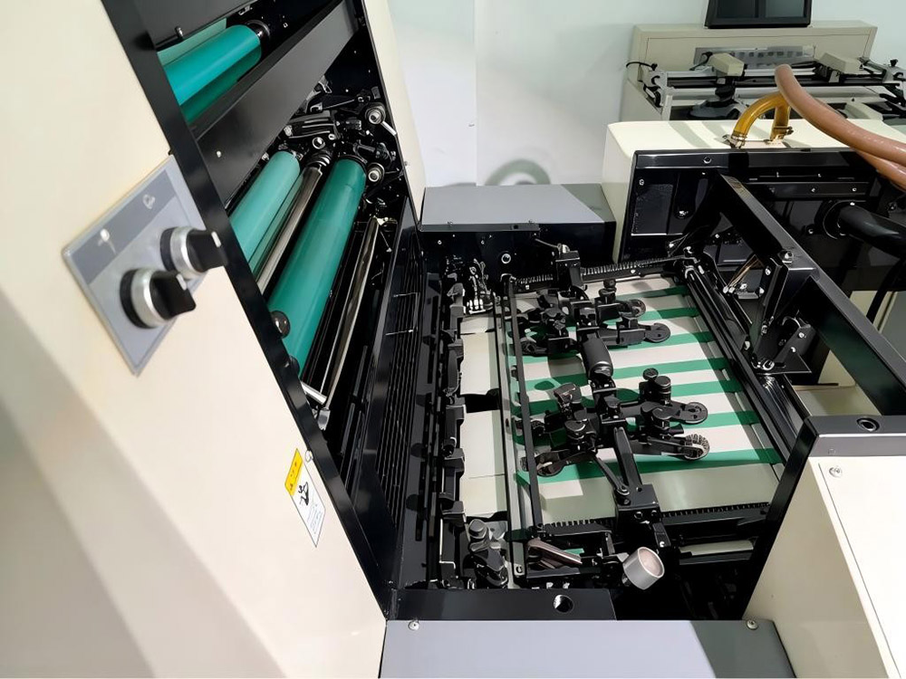 6) Mechanizmy transportu papieru, takie jak głowica podająca papier, stół papieru, przednia prowadnica i chwytaki papieru, zapewniają, że prasa może drukować na szerokiej gamie papierów, od grubego papieru do cienkiego papieru.